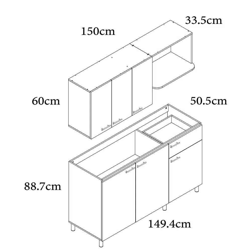 Dimensiones mueble inferior | Largo: 1.49m, Profundo: 50.5cm, Alto: 88.7cm |