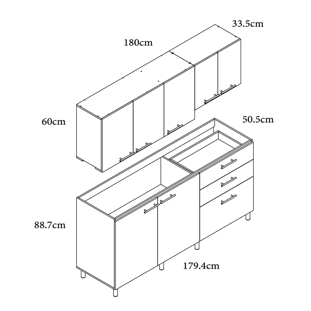 Dimensiones mueble inferior | 1.79m, Profundo: 50.5cm, Alto: 88.7cm |